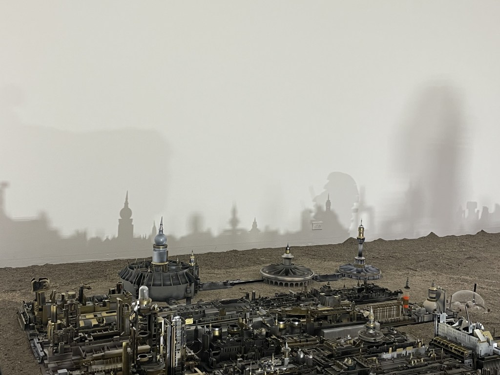 La propuesta artística es expuesta desde febrero pasado y hasta agosto, en una de las salas del Museo de Arte de El Salvador. En ella, el visitante se encuentra con una ciudad futurista construida con desechos de aparatos electrónicos sobre un campo de arena.