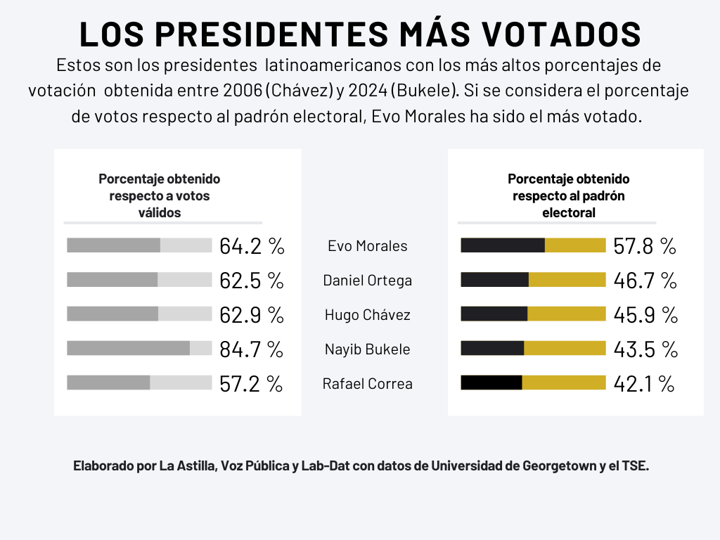 Los datos revelan que aunque Bukele ha obtenido el mayor porcentaje de votos válidos en una elección presidencial, cuando se comparan los porcentajes de votos obtenidos por estos presidente reelectos respecto al padrón electoral, es decir, respecto a las personas que podrían haber votado en un evento electoral, Bukele es superado por Chávez, Morales y Ortega.